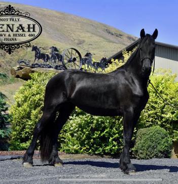 Asawni is a baroque, studbook FHANA mare, like many of the baroque type friesians she is exceptionally gentle and easy to ride, she stands at 15.3. While she was not tested as a young mare in 2025 she went to the Spokane Keuring and was entered into the studbook. With a very impressive kinship of 16.5, as a broodmare, Asawni can contribute towards the diversification of the Friesian breed.